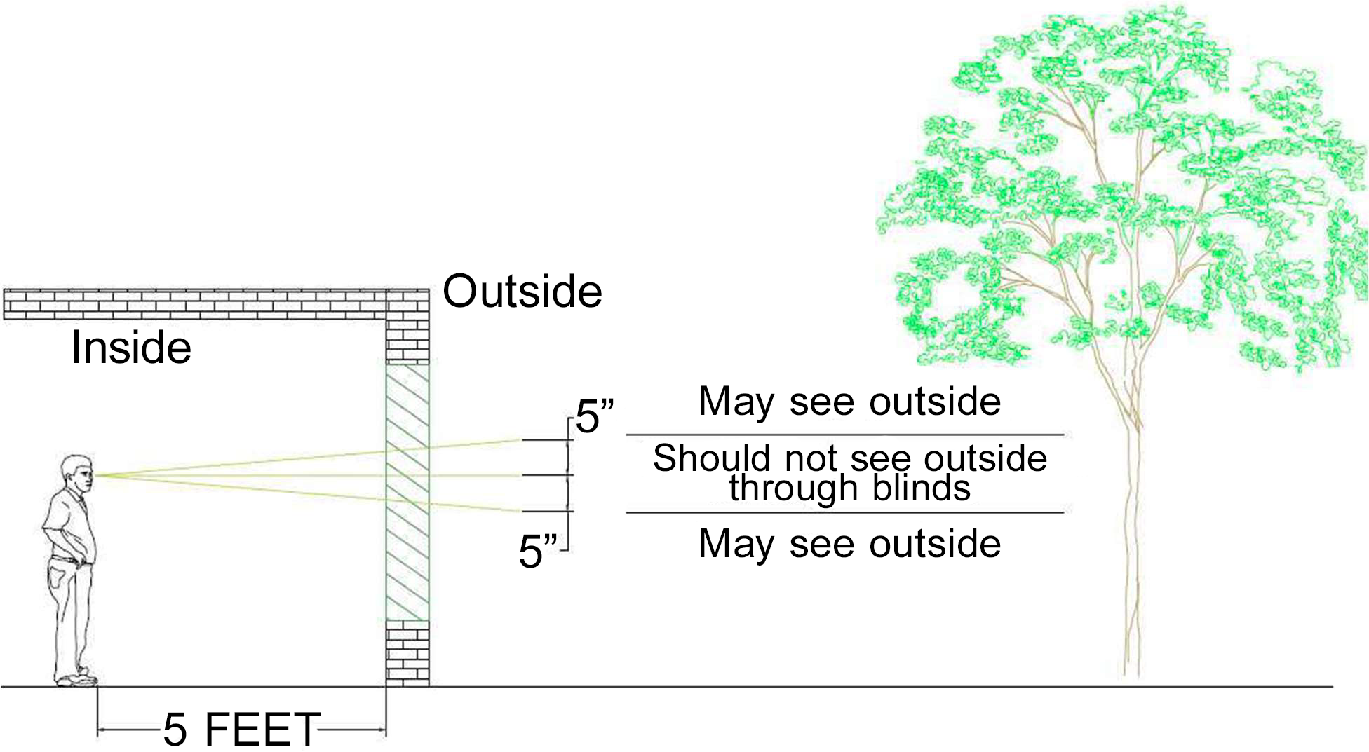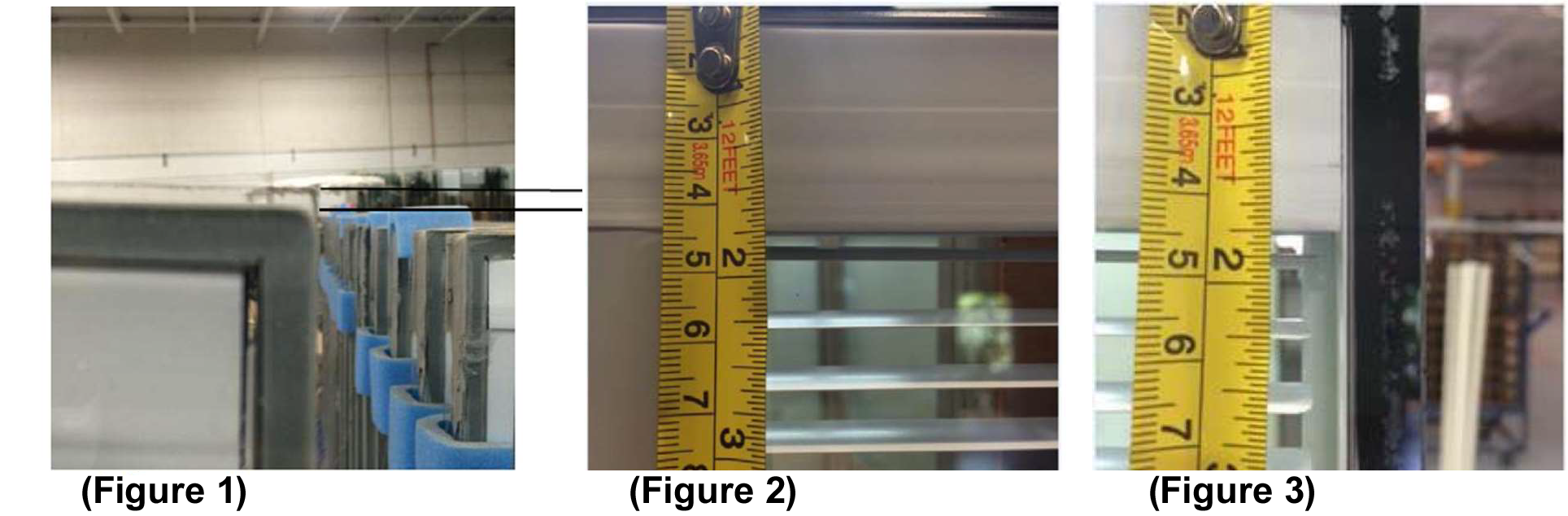 - Blinds are to be inspected visually first. Any blind that appears to be out of alignment shall then be measured using a tape measure. Blinds out of alignment are indicated by the location of the glass regarding how straight the sides are and how level the top is (Figure 1). Two measurements shall be taken for each blind slat that is questionable. Take measurements from the edge of the glass to both ends of the blind slat in question (Figures 2 & 3).